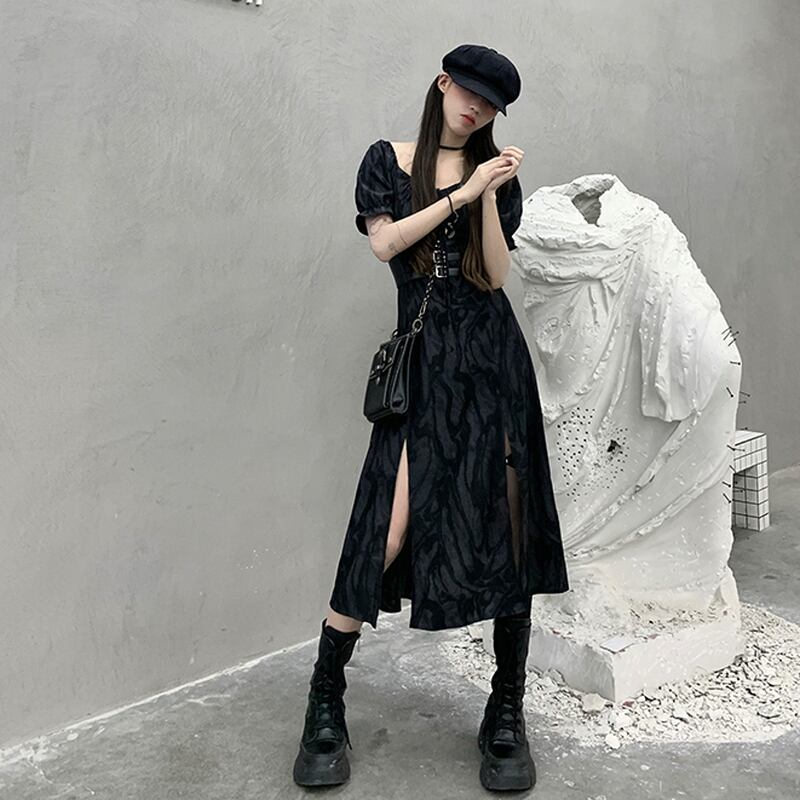 サブカル 服 地雷系 通販 ゴスロリ ワンピ ウエストベルト付き パフスリーブ ハイウエスト ロング丈 サイドスリット 美脚見せ 闇かわいい ハードガール ゴシック ロリータ