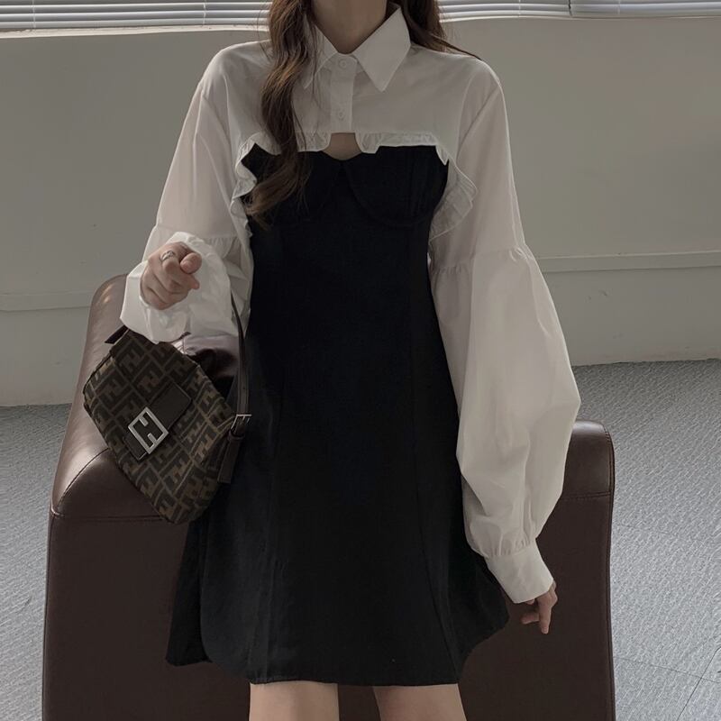 フェミニンなバルーンスリーブのシャツにヘルシーなジャンパースカートのセットだからプチプラ