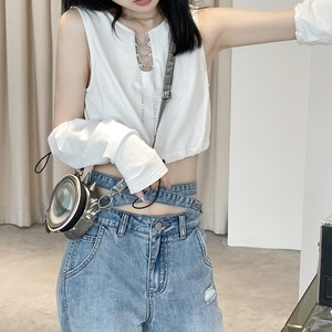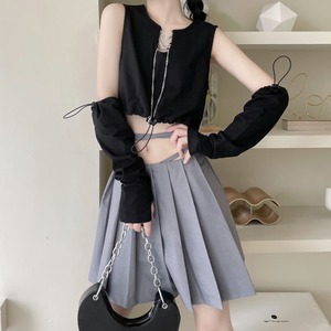ノースリーブにデコルテを可愛く見せてくれるチェーン編み上げがおしゃれなトップス。