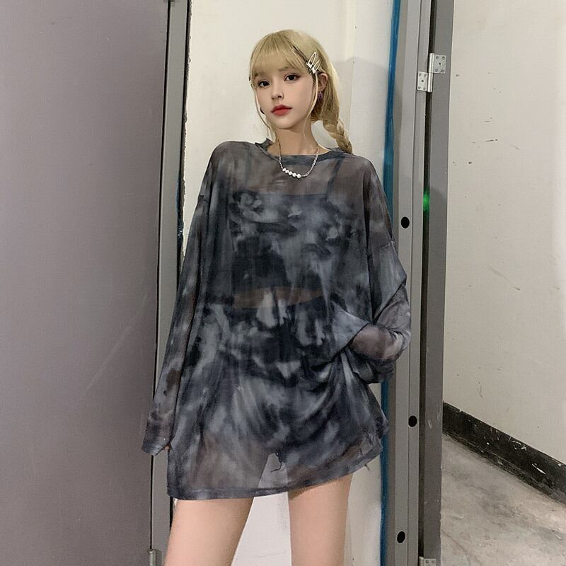 サブカル 服 地雷系 通販 シアーシャツ 日焼け防止 メッシュ 透け感 レトロ 絞り染め風 黒ゴス