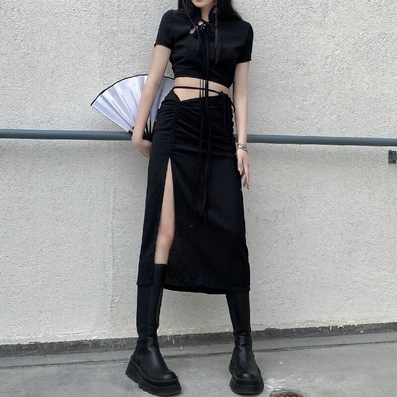 サブカル 服 地雷系 通販 上下セット オールインワン ショート丈 シャツ へそ出し ギャザー スリットスカート フェミニン リボン 闇かわいい ゴスロリ原宿女子 韓国系