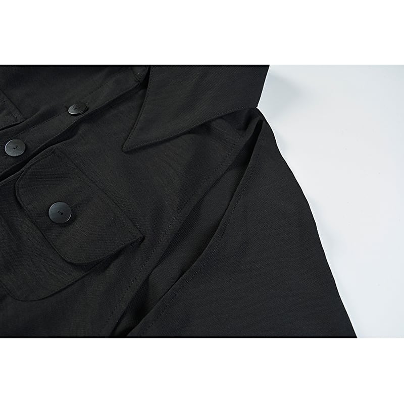 V字ネックにフラップポケット、ウエストマークはバックルベルトでしっかりハイウエストをキープ。