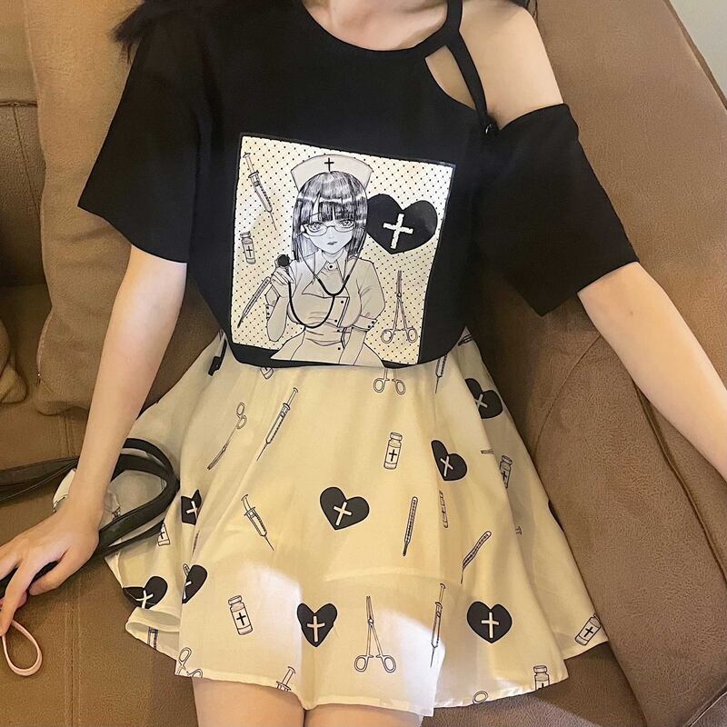 サブカル 服 地雷系 通販 フレアスカート ミニ丈 ハート 十字架 注射 闇かわいい 甘め かわいい ゴスロリ 原宿女子 韓国系