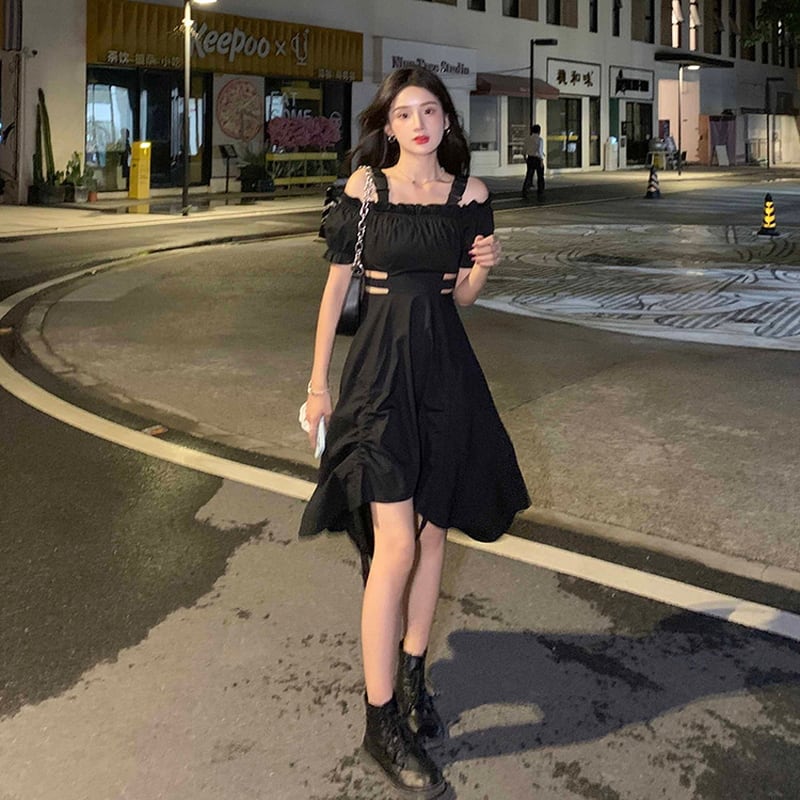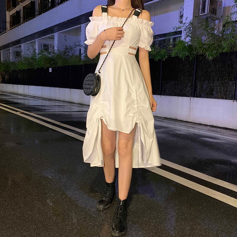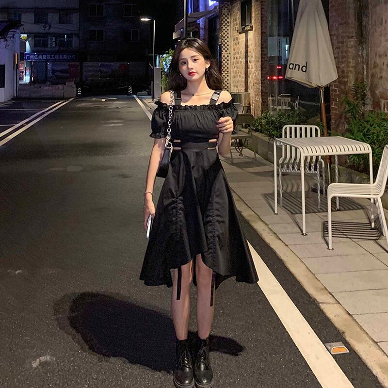 サブカル 服 地雷系 通販 闇かわいい ワンピ オフショル フリル ギャザー アシメ丈 闇かわいい ゴスロリ darkness原宿女子 韓国系