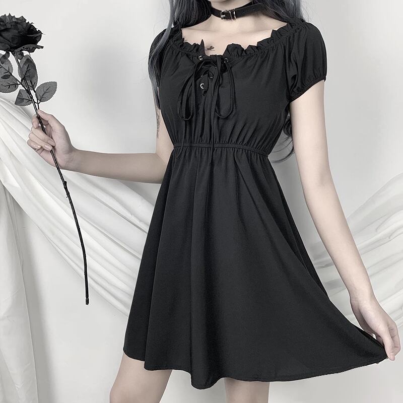 サブカル 服 地雷系 通販 闇かわいい オフショル ワンピ レースアップ ハイウエスト 膝上丈 ゴスロリ系
