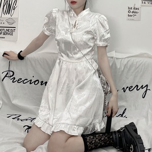 サブカル 服 地雷系 通販 ワンピ チャイニーズワンピ ミニ マオカラー フリル 光沢 透かしデザイン原宿女子