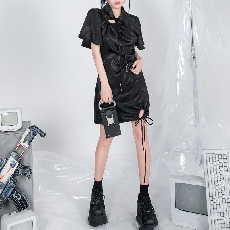 サブカル 服 地雷系 通販 闇かわいい ミニワンピ ハードガール 十字架 裾リボン ドラゴン 中華風ハードゴシック パンク