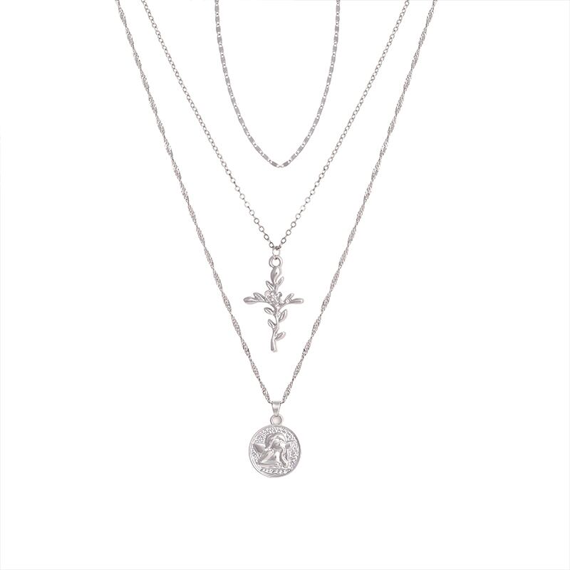 コイン型のチェーンとフラワー十字チェーンのネックレス。