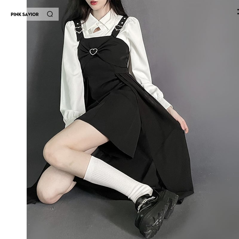 サブカル 服 地雷系 通販 スカート JSK ジャンパースカート ロング丈 アシンメトリー ハイウエスト ハートリング リボン 甘め ガーリー ロリィタ 量産型