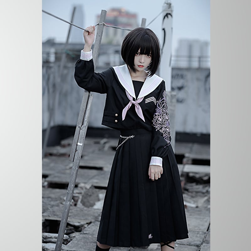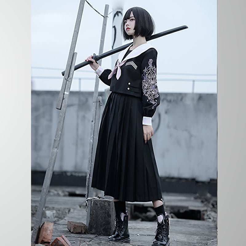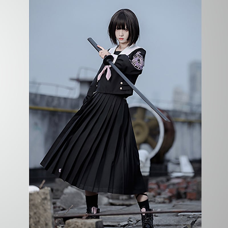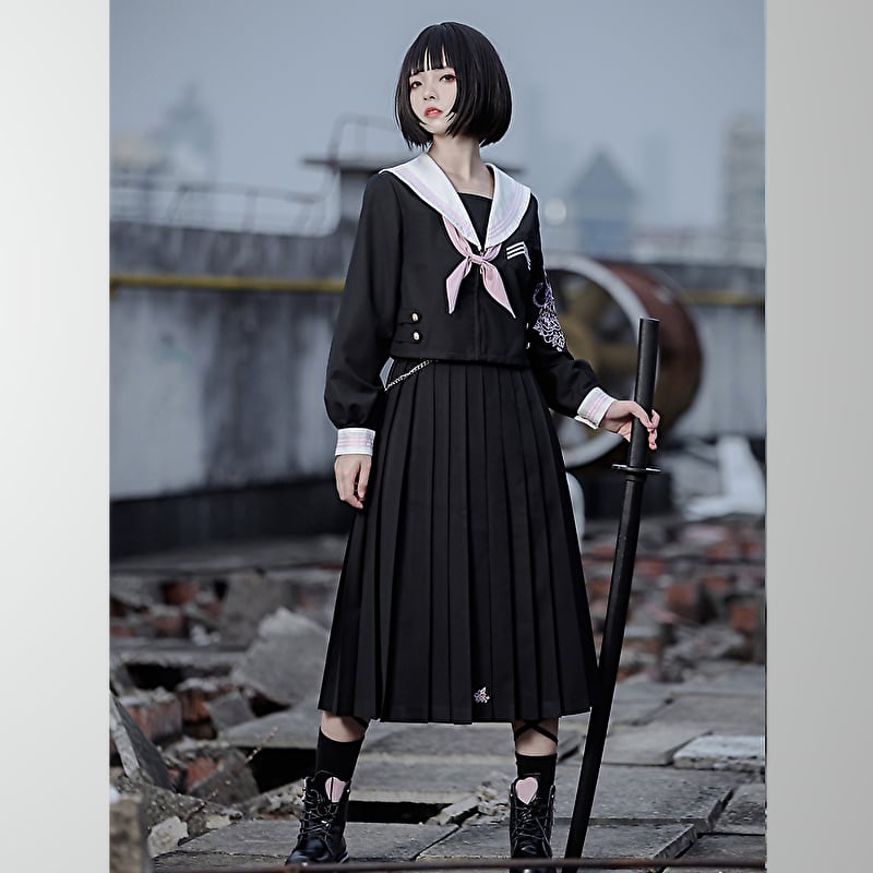 病み可愛いJKセーラー服にロングプリーツスカートのツーピースです。