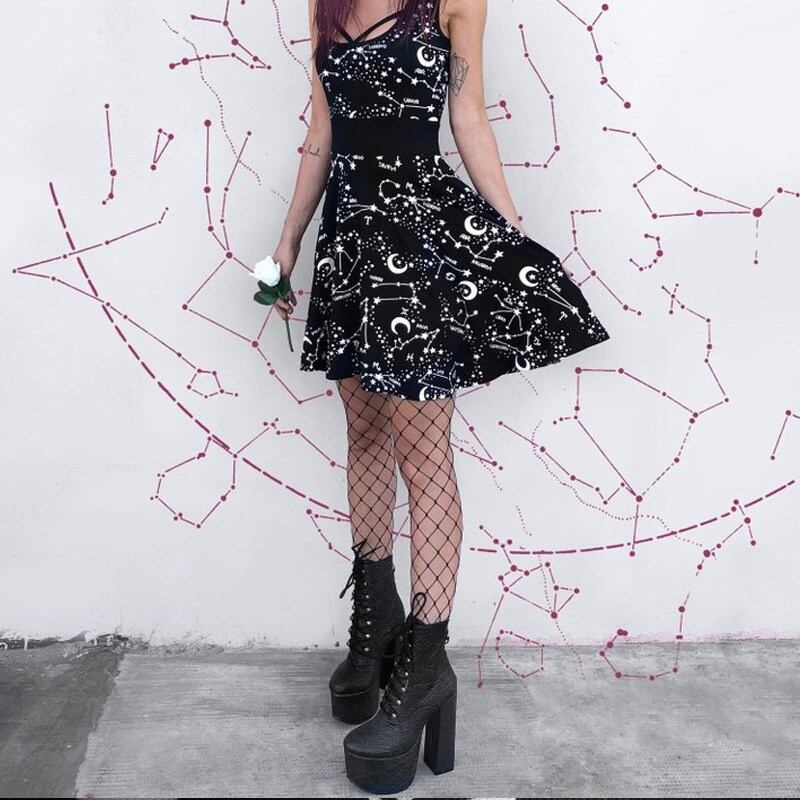 ハイウエストなウエストマークに三日月と星座柄のワンピ