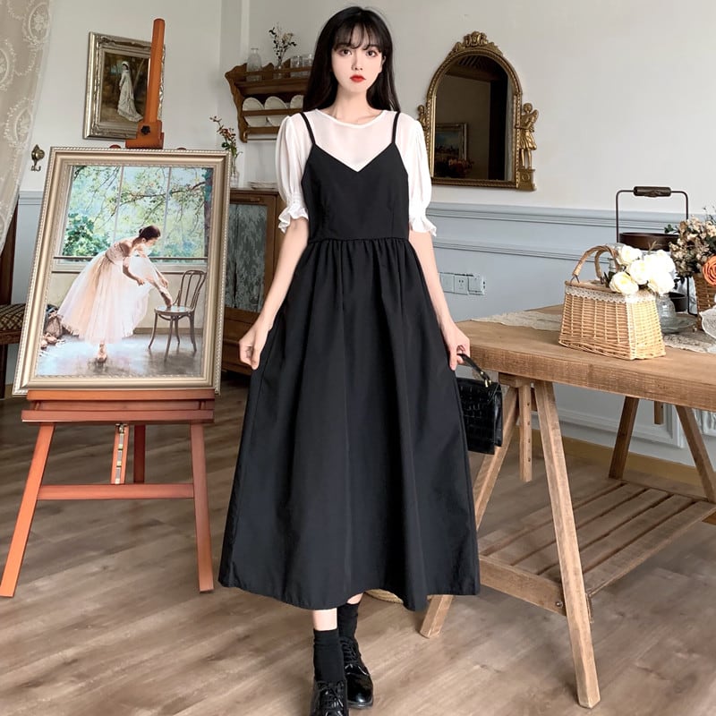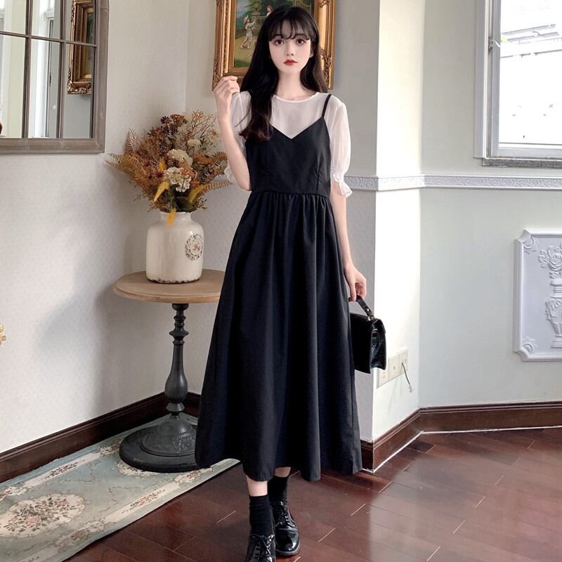 トップスはトレンドの透け感のある半袖、ジャンパースカートはハイウエストにロング丈のフレアースカート