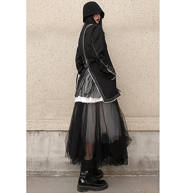 トップスはブラックのデザインシャツなどお手持ちのシャツをセレクトすれば、ストリート系のちょっぴり大人可愛いスタイルに仕上がります。