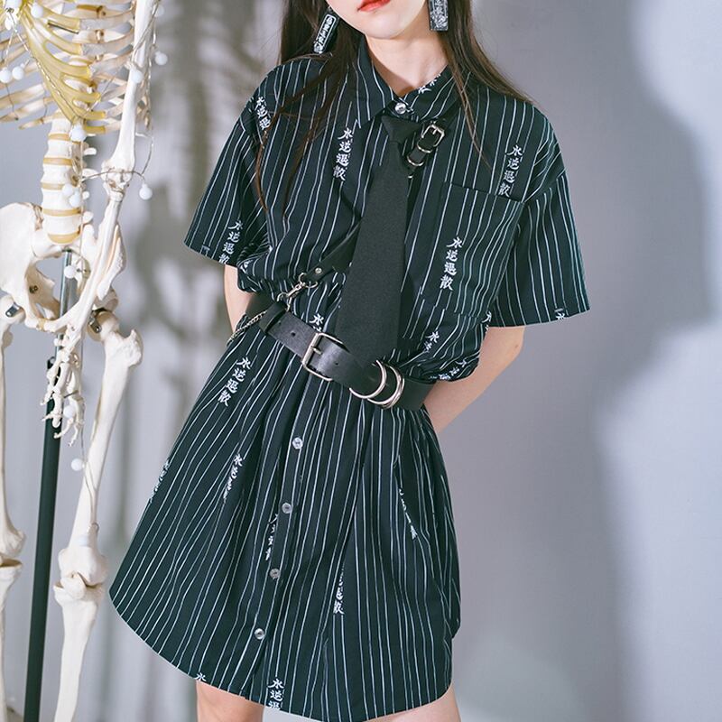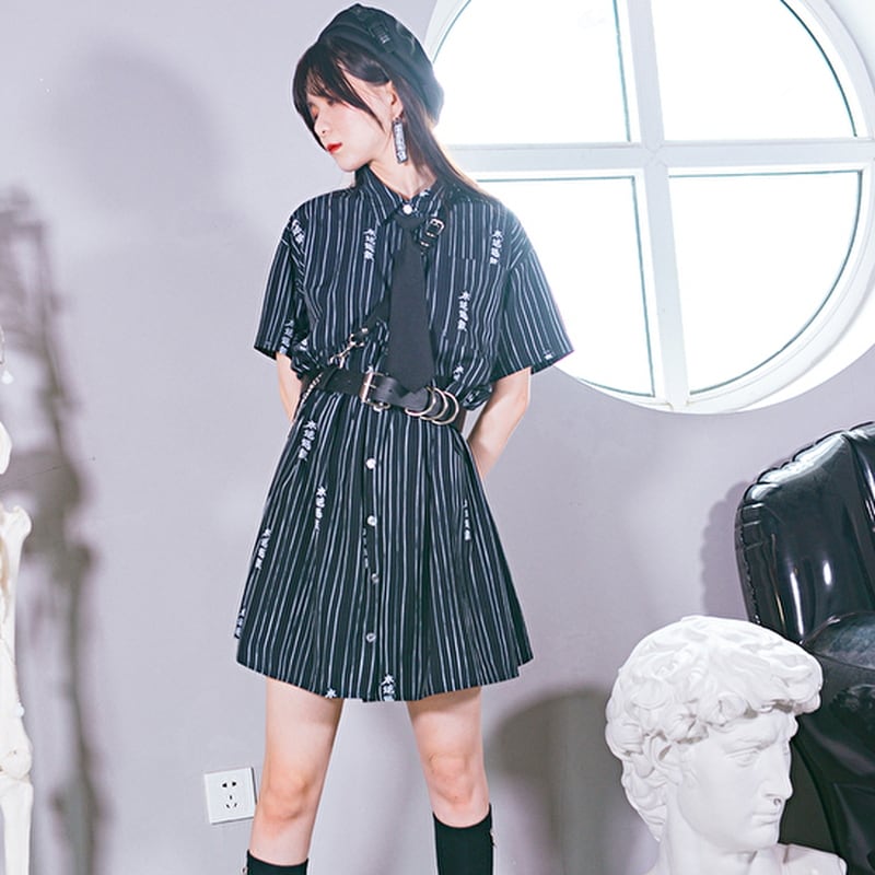 サブカル 服 地雷系 通販 チャイナ風服 チャイナ風服 古怪舎レトロ シャツワンピ 2Way 半袖 長袖 切替 漢字 ストライプ 闇かわいい大人増し サブカル服