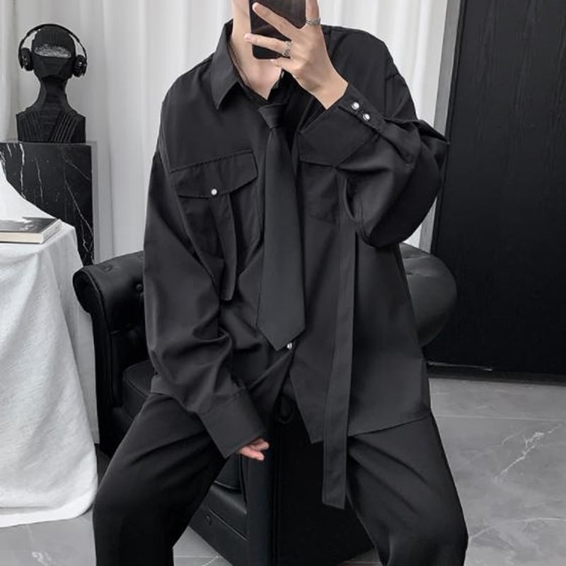 サブカル 服 地雷系 通販 メンズ シャツ フラップポケット ネクタイ付き 闇かわいい おしゃれ ビッグシルエット かっこいい