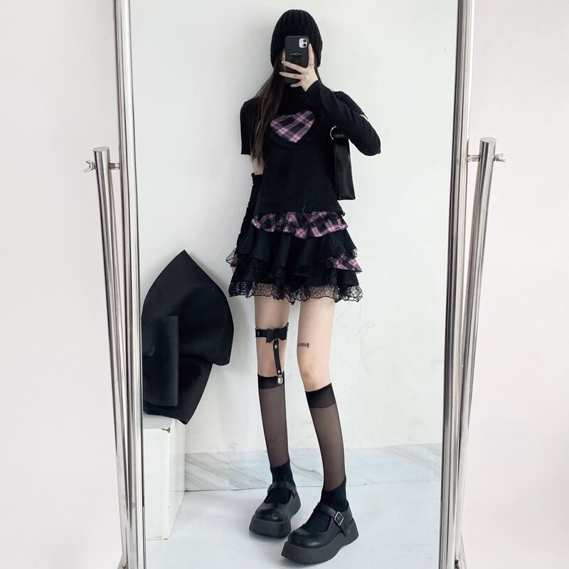 サブカル 服 地雷系 通販 ツーピース オールインワン ピンク チェック柄 アームカバー付き レース ミニスカ ハートバンギャ
