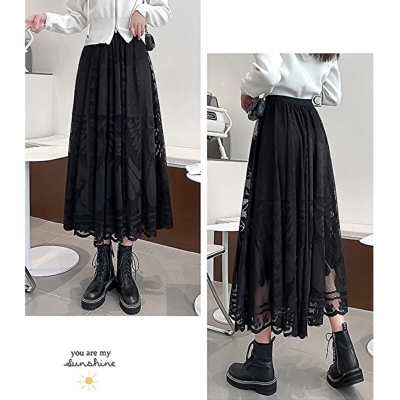 シアーなレースのロングスカート、細見えなハイウエストが大人可愛いデイリーに着回せます。