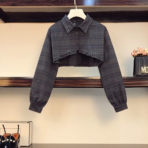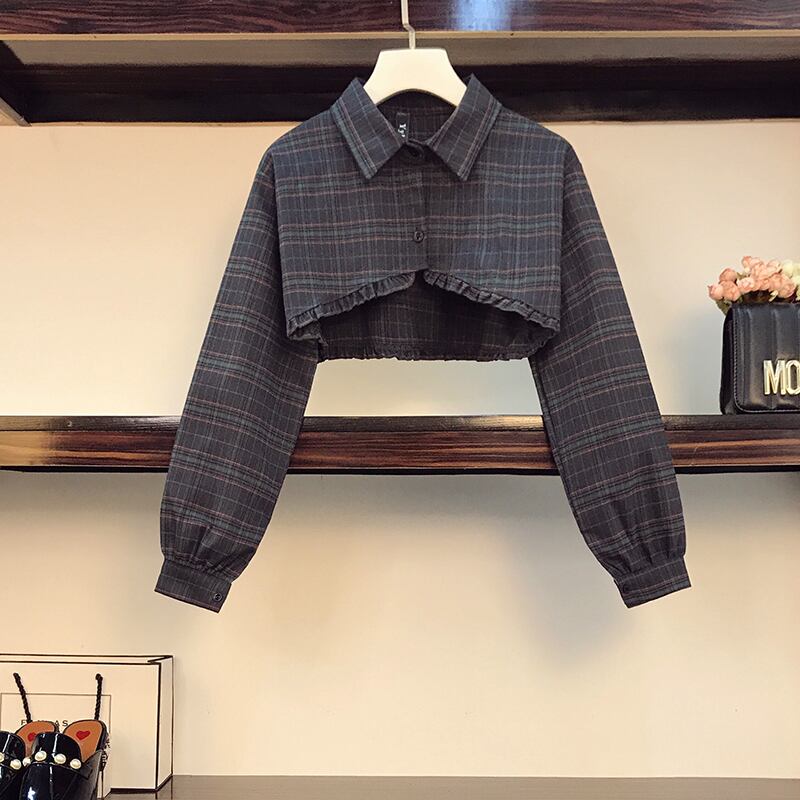 短い着丈のチェック柄シャツとアシンメトリーなミモレ丈ジャンパースカートです。