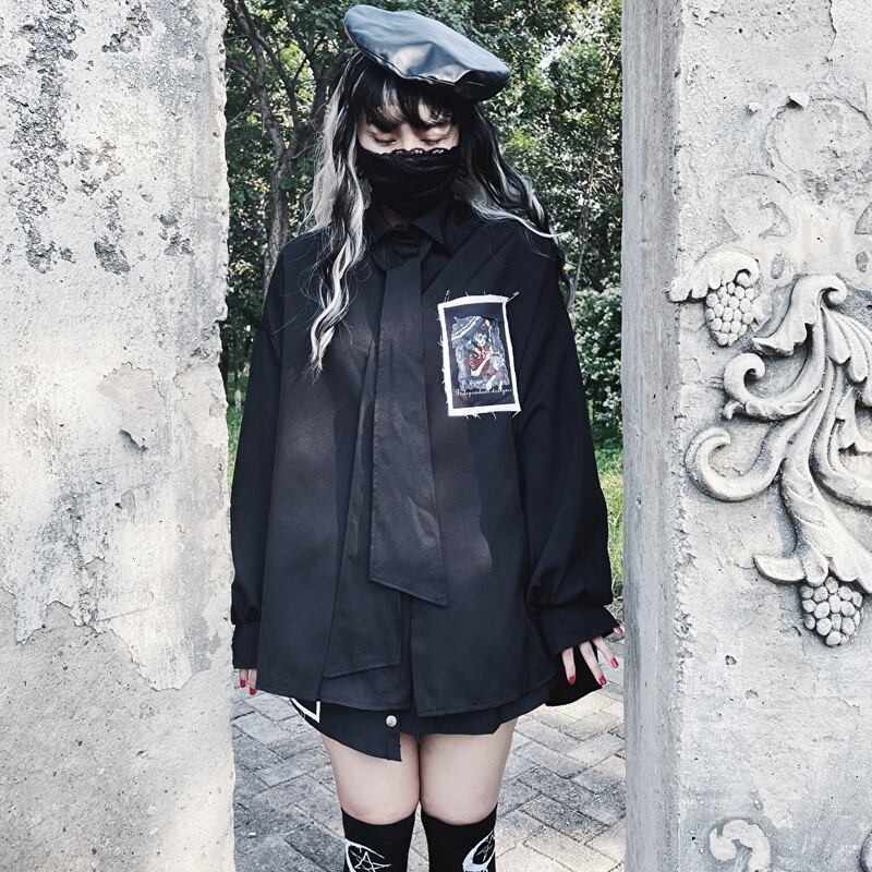 サブカル 服 地雷系 通販 Miub 黒シャツ ボウタイ 闇かわいい ゴシック ワッペンバンギャ