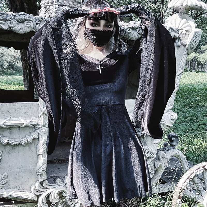 サブカル 服 地雷系 通販 Miub ワンピ ワイドスリーブ 刺繍 五芒星 クロス 十字架 レース 闇かわいいバンギャ