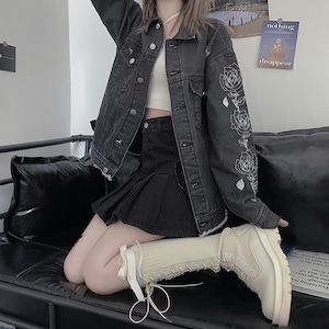 サブカル 服 地雷系 通販 CRAZYGIRL 秋冬 デニム ジャケット ホワイトローズ 刺繍 クラッシュ ダメージ加工 闇かわいい JK