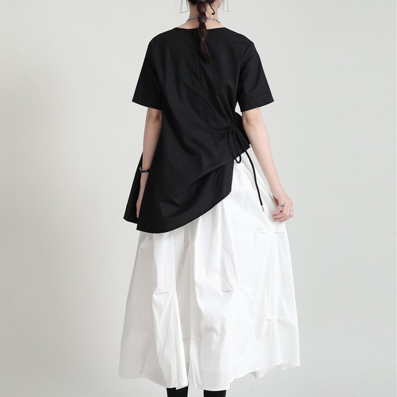 アシンメトリーな裾デザイン、ロングドレープラインがかわいめ