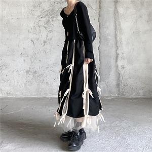 深めのスリットとスカート襞を結ぶリボン、スカート裾はレースレイヤードだから可愛さもプラス