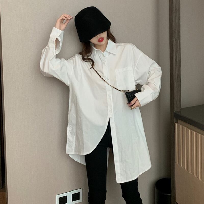 シャツワンピとしても使い回せるロング丈、裾回りはアシンメトリーなゆったりめ