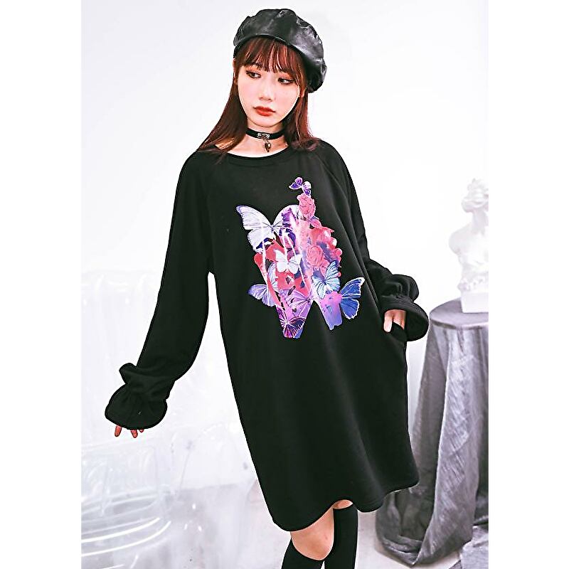 サブカル 服 地雷系 通販 チャイナ風服 チャイナ風服 古怪舎オリジナル ロングセーター butterfly 裏起毛 フリース 秋冬 厚手 防寒 袖コン 闇かわいい ゴシック系大人増し サブカル服