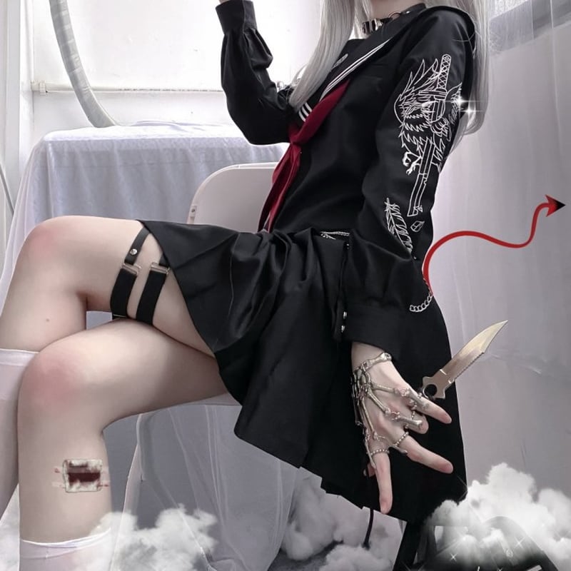 サブカル 服 地雷系 通販 花見森 オリジナル JK制服 上下3点セット セーラー服 長袖 ロング丈 プリーツスカート スカーフ 学園 バッドガール クール 闇かわいい