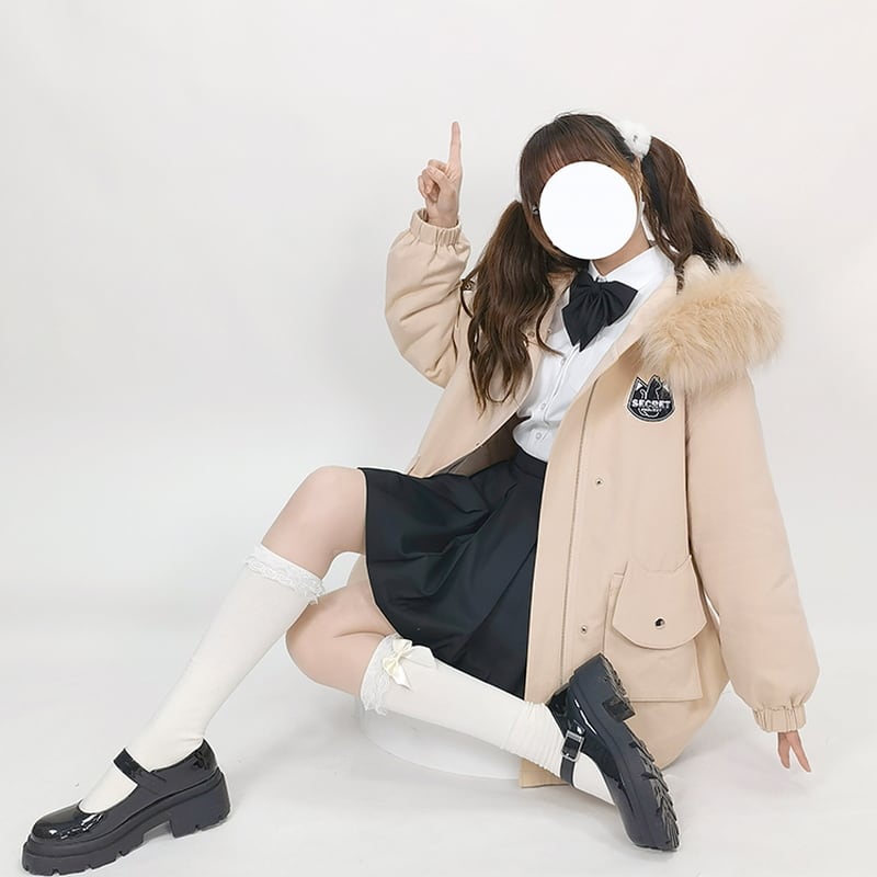 重量感のある厚手生地にフェイクファーのフードが可愛い