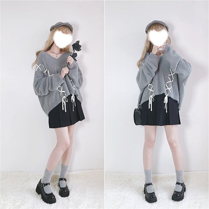 サブカル 服 地雷系 通販 Catwish ロリータ ふわふわ せーター V字ネック レースアップ オーバーサイズ 可愛い 量産型