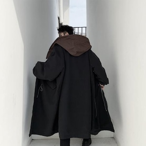 サブカル 服 地雷系 通販 メンズ コート フード付き ロング丈 オーバーサイズ ウエスト紐 ビッグシルエット ゴシック 韓国