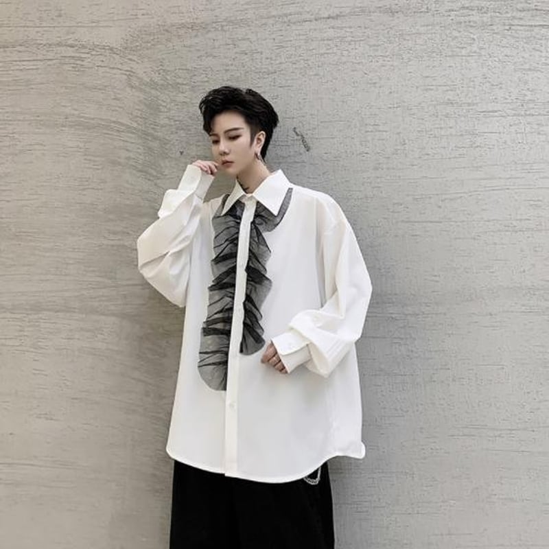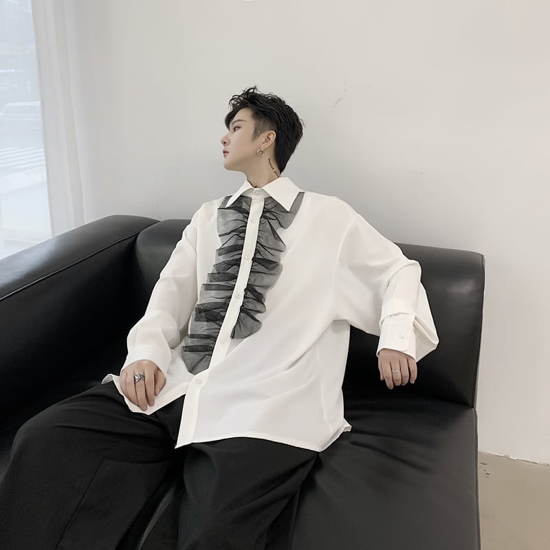 ブラックのフリルレースがおしゃれなメンズ長袖シャツ