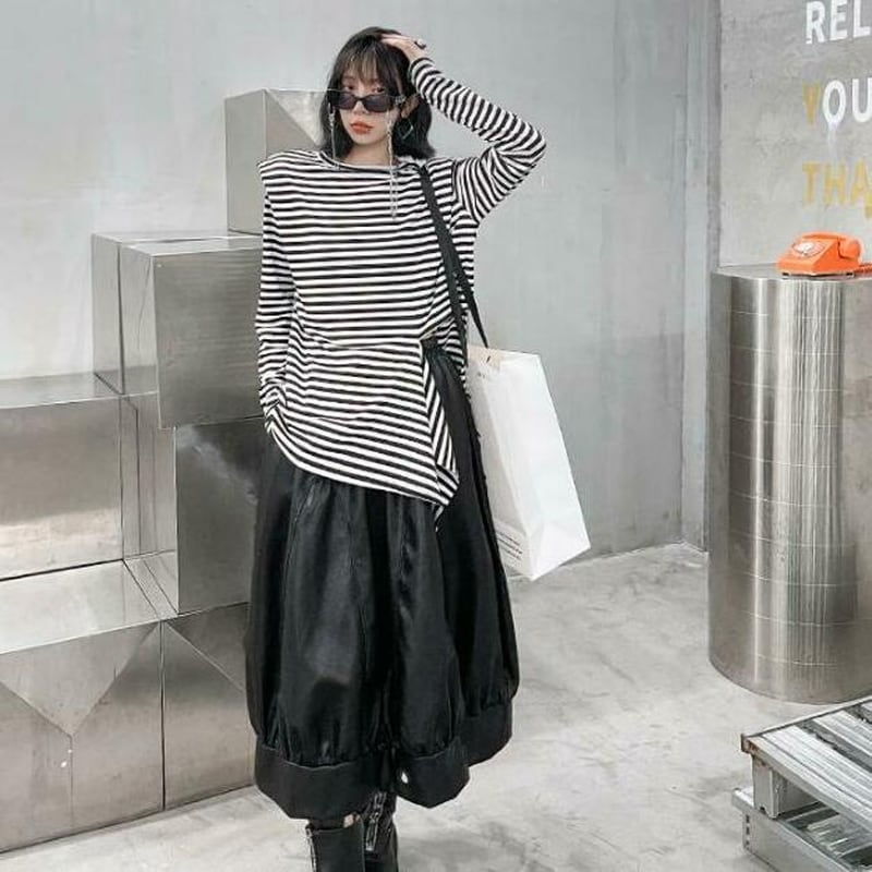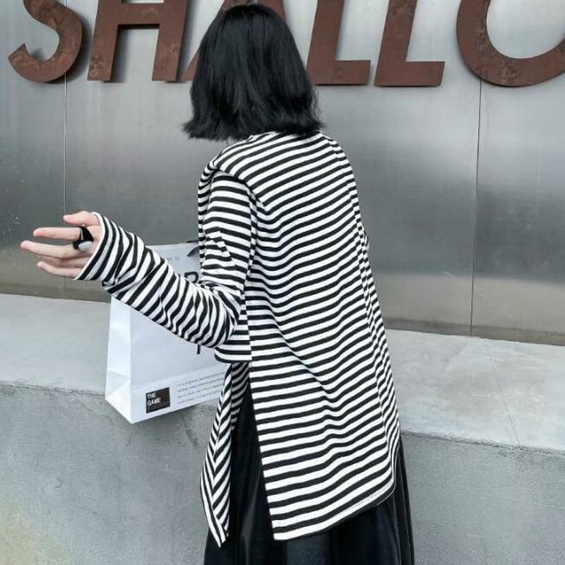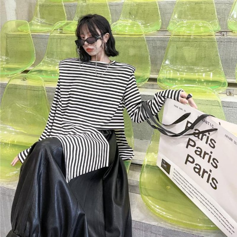 サブカル 服 地雷系 通販 モード系 長袖 Tシャツ ボーダー柄 肩パッド 異形デザイン カジュアル 韓国ファッション