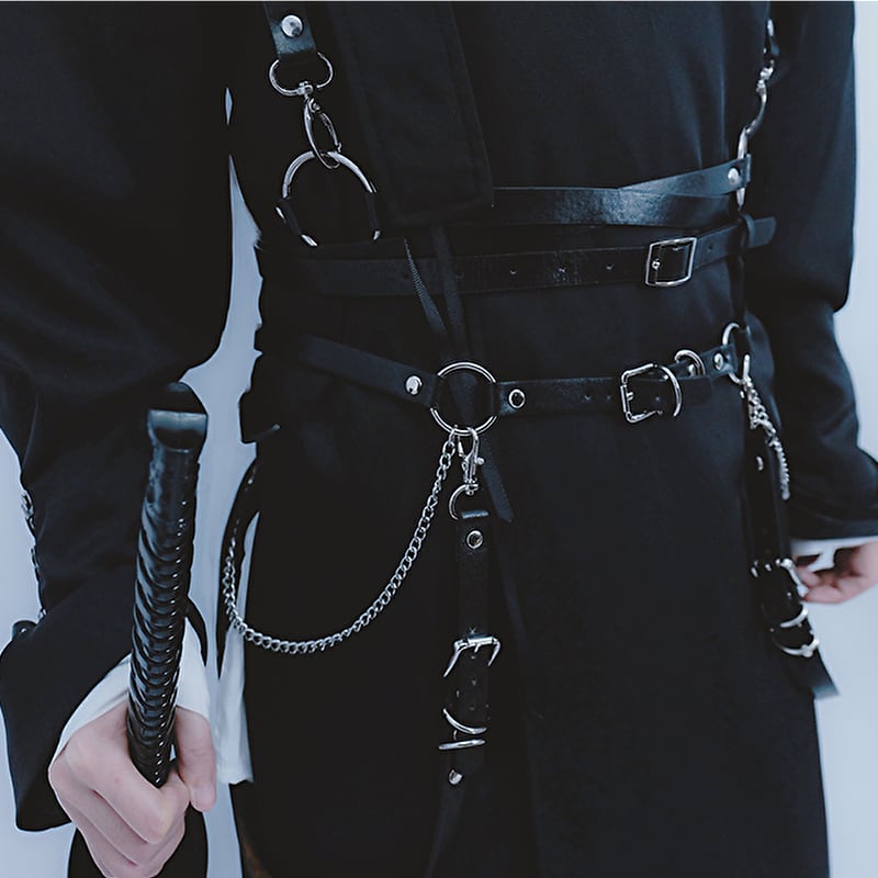 サブカル 服 地雷系 通販 ロング コート ユニセックス ミリタリー風 チェーン ブローチ レザー ストラップベルト 暗黒系 闇かわいいゴシック