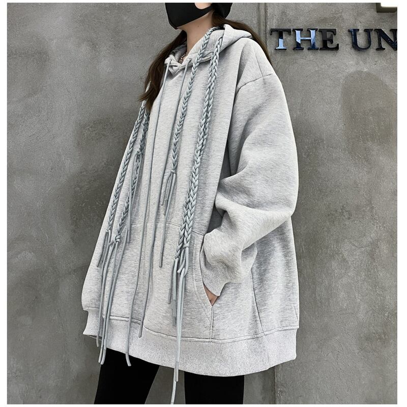 大振りな編み上げストラップが超個性的、ヒップも隠れるロング丈のオーバーサイズです