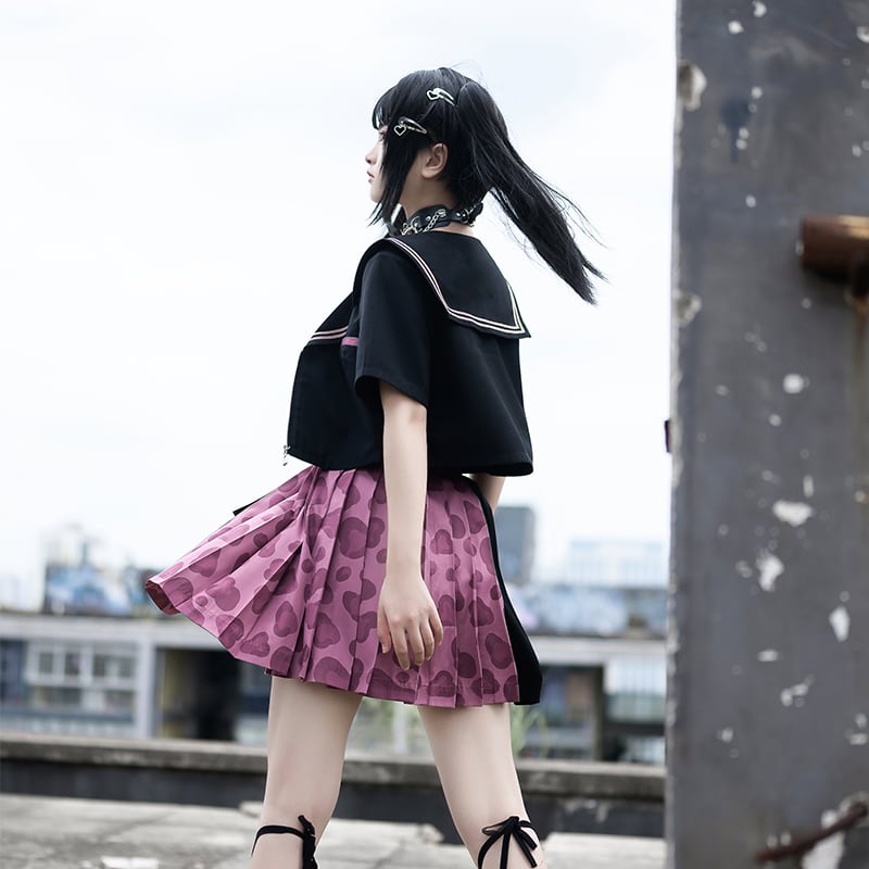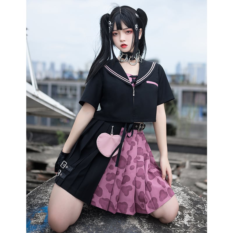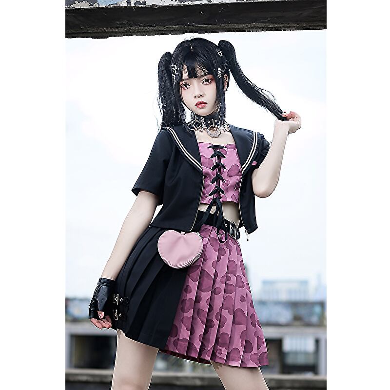 病み可愛い編み上げチューブトップにJK制服風のジャケット、ピンクのプリーツミニに巻きスカートがホット