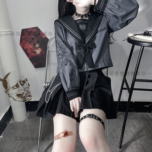 スリーブに描かれた病みカワなキャラ刺繍のセーラー、着丈42cmのプリーツミニ、蝶ネクタイにチェーン、ソックスの5ピースフルセットです。