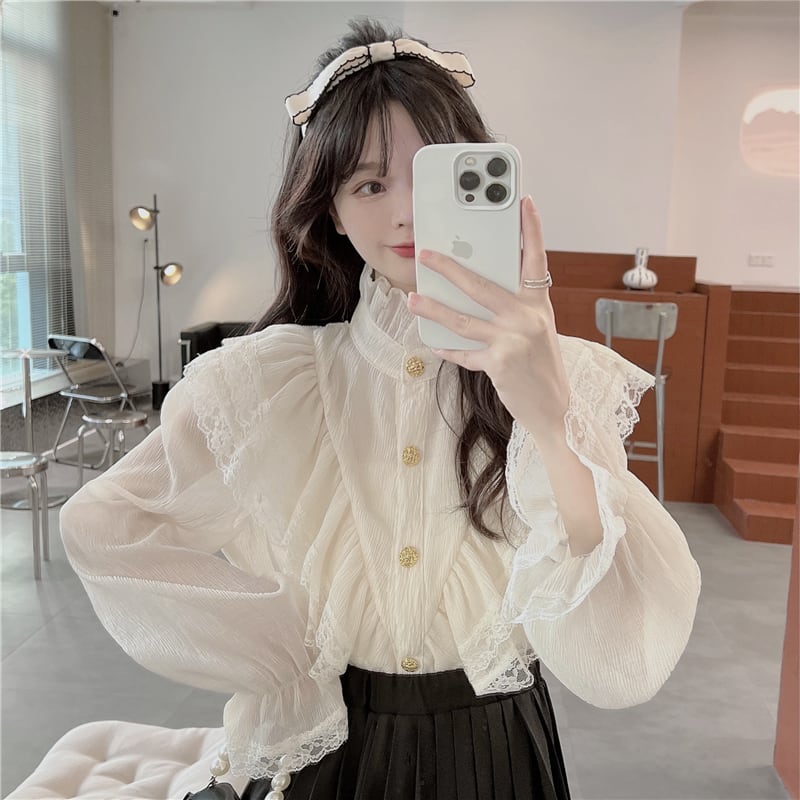 甘いネックギャザーにレースフリルが可愛いブラウス