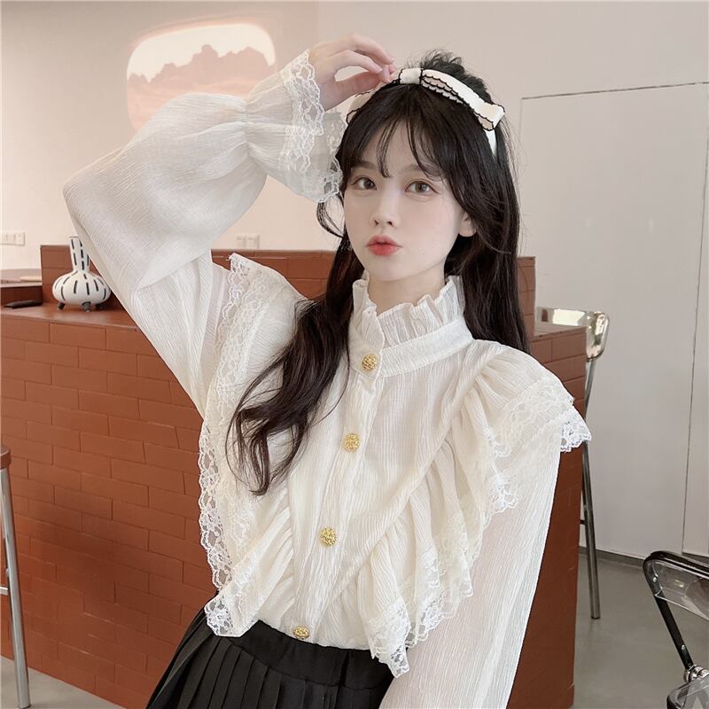 サブカル 服 地雷系 通販 ブラウス 甘め ネックギャザー 袖コン レースフリル ガーリー かわいい プチプラ 量産型 韓国ファッション