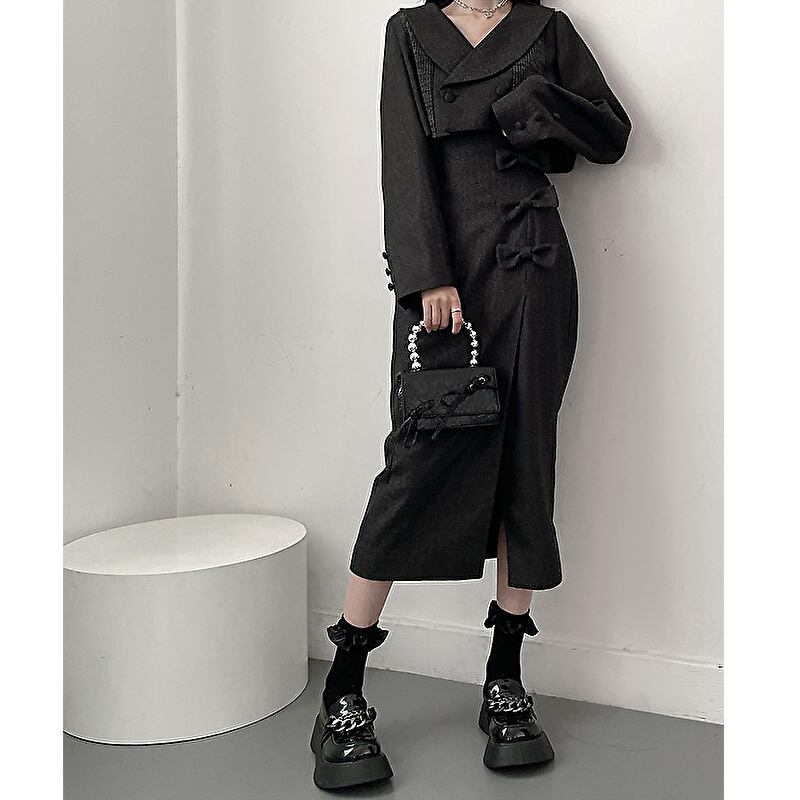 サブカル 服 地雷系 通販 pinksavior スカート ロング丈 ハイウエスト スリット リボン レトロ ゴシック 闇かわいい スーツ フェミニン 量産型