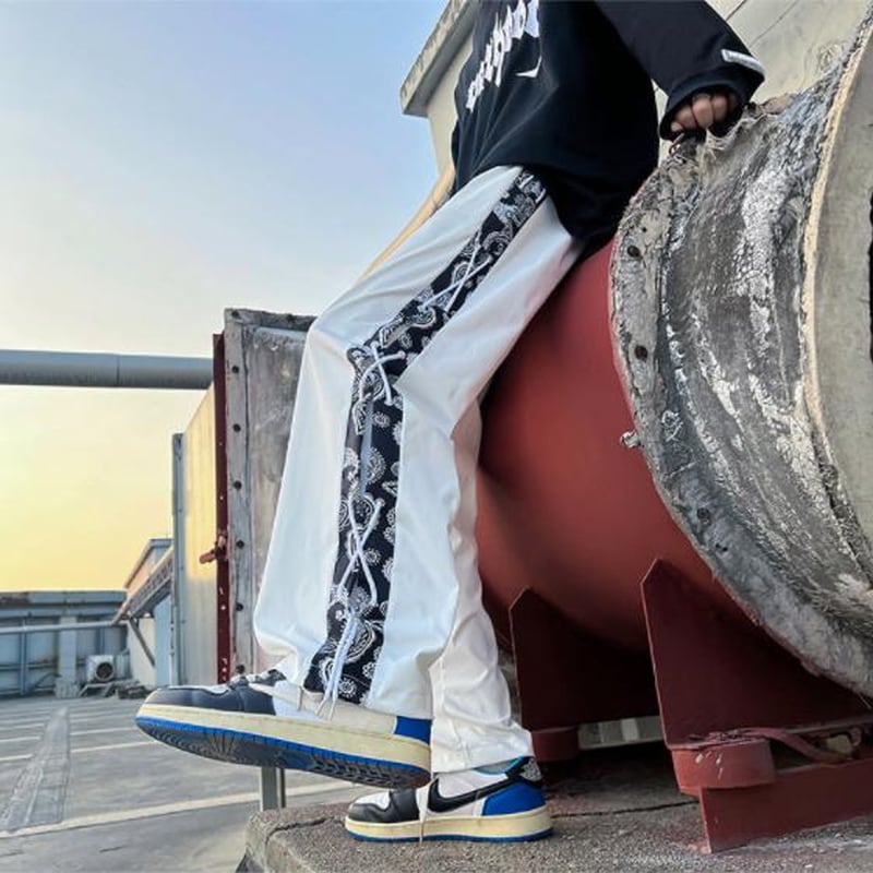 ペイズリーに花柄プリント、編み上げがビジュアル抜群なストリート系パンツです