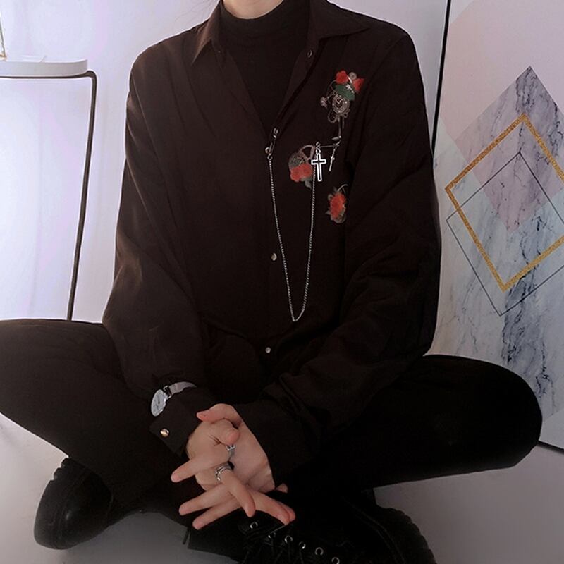 サブカル 服 地雷系 通販 長袖シャツ ユニセックス 十字架 クロスチェーン 薔薇 ワンポイント闇かわいい レトロ ゴシック
