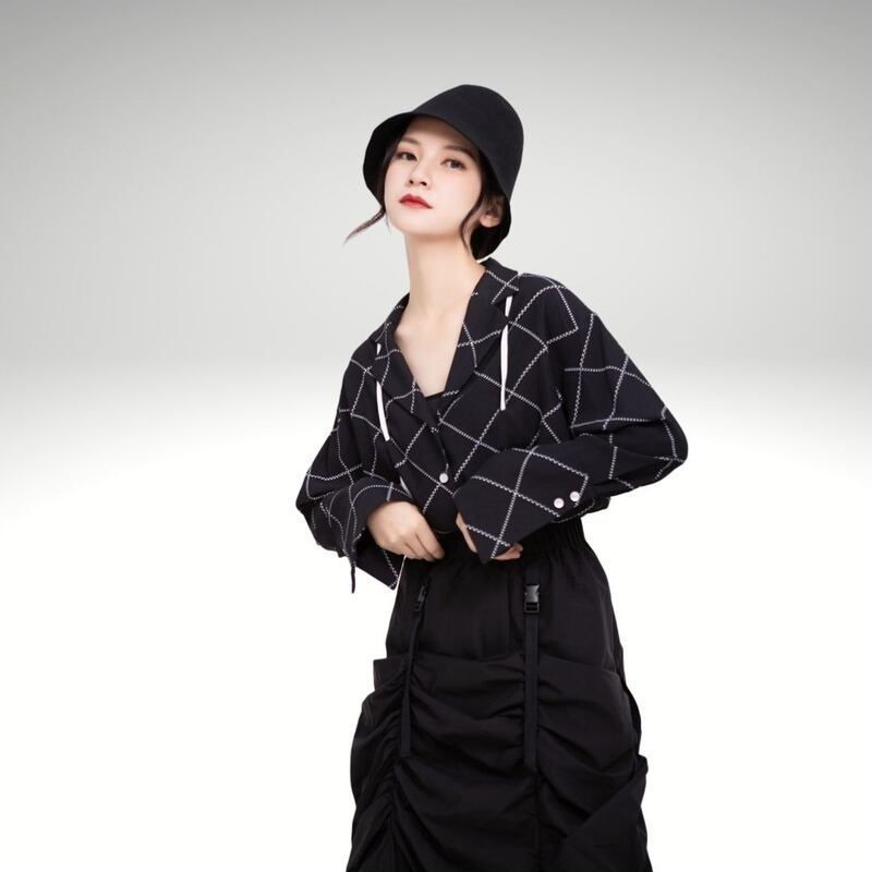 ストラップで巾着ギャザーに調整できる個性的デザインのスカート