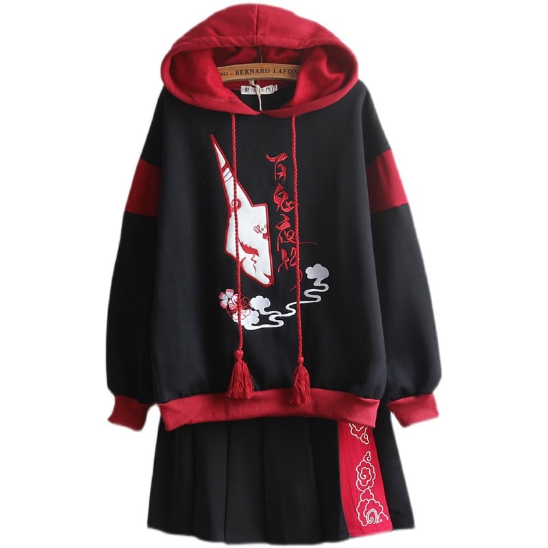 百鬼夜行の漢字刺繍に狐面の刺繍、ビジュアルインパクト抜群なタッセルが病み可愛いパーカーとプリーツミニスカのツーピース