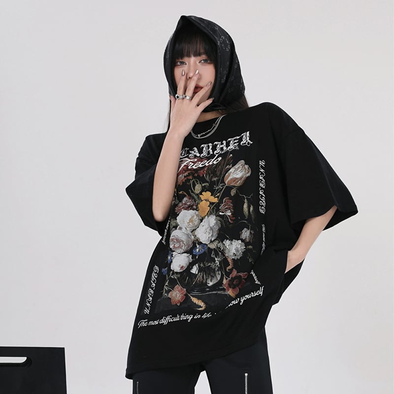 サブカル 服 地雷系 通販 半袖 Tシャツ バッグロゴ レトロ フラワープリント ゴシック 闇かわいい