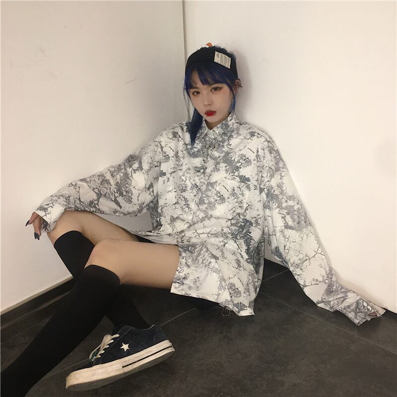 サブカル 服 地雷系 通販 ショルダーバッグ長袖シャツ レトロ インクプリント カジュアル