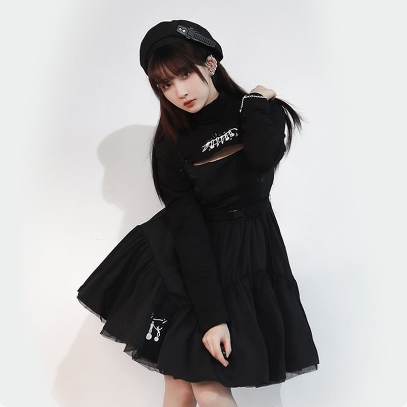 ハイウエストなバックルベルトにスカートは切替フレアスカート、別売りの長袖Tシャツとコーデして病み可愛いJKサブカルスタイルに仕上がります。