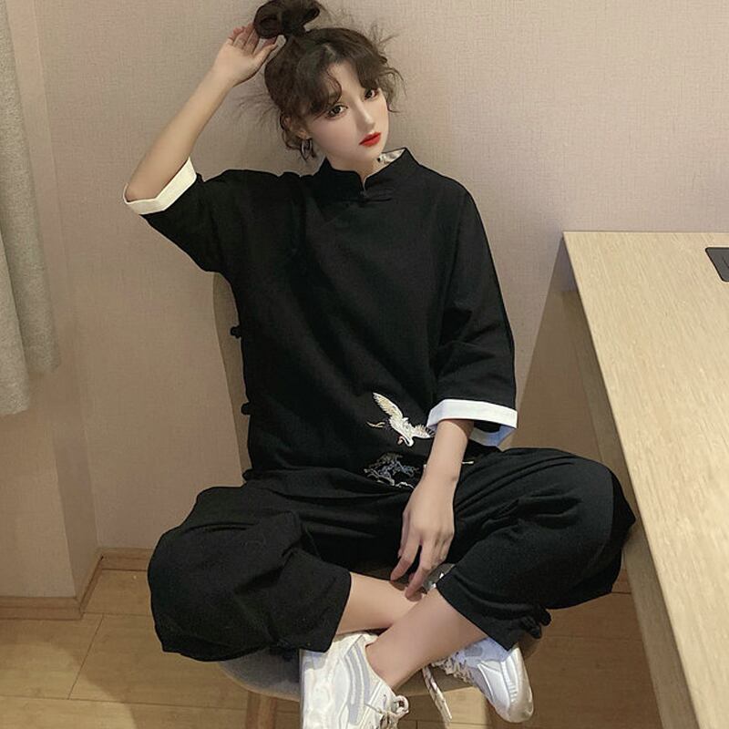 高見えな鶴刺繍のトップスに楽ちんハイウエストのイージーパンツのセットです。
